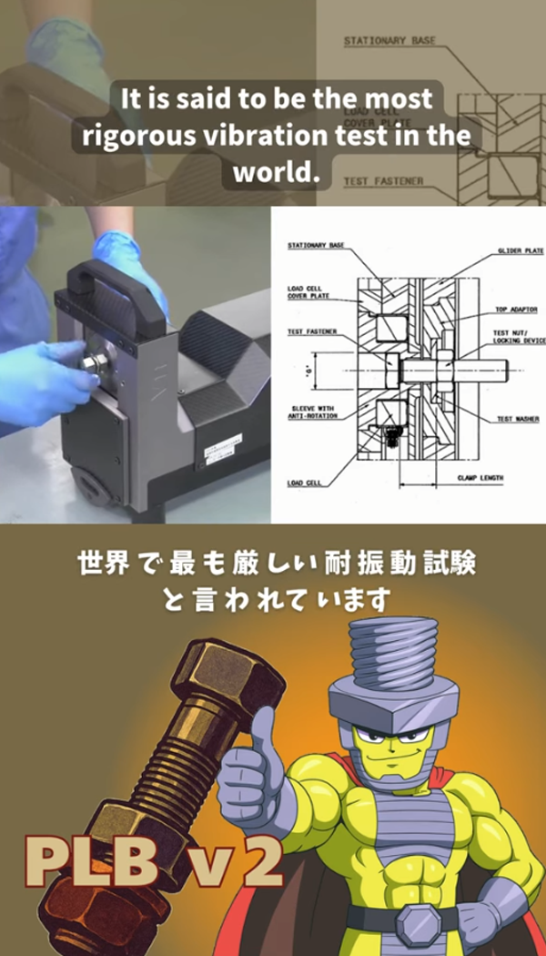 上記試験において、下記動画のように一般的なナットは振動開始直後に緩み始めることに対し、PLB v2は試験終了の2000サイクルまで緩むことなく、約88%の残存軸力(締結力)を維持しております(ISO16130の基準では、残存軸力が85%以上であれば最高位の「緩み止め効果 良好」と判定されます)。