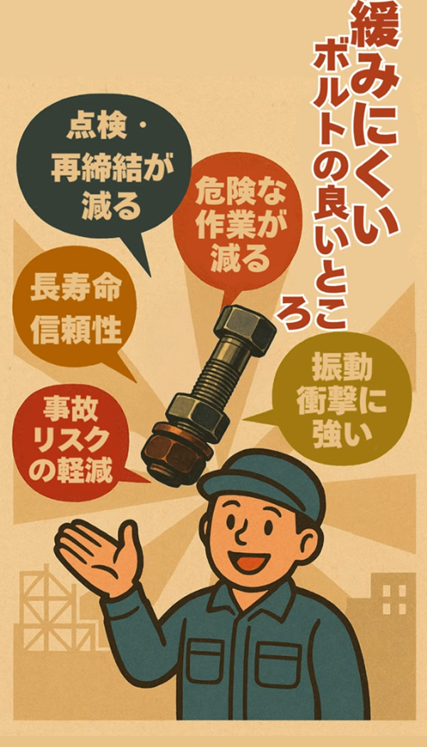 振動が多く定期的な増締めが必要な箇所、構造的に緩んでは困るような箇所に最高の緩み防止ソリューションです。
